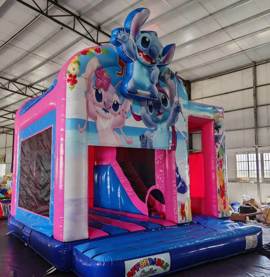 Our NEW STITCH CASTLE certainly has THE WOW FACTOR for any party, Digitally printed artwork to a large3D STITCH on top of front of castle and a large bounce area where u go up and over slide and is sure to be lots of fun for all boys and girls. fully covered in case it rains too..