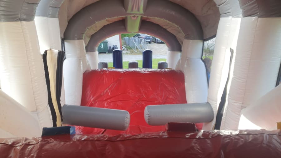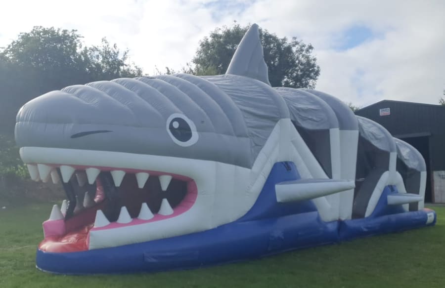 Our 36 ft Shark Obstacle Course is perfect for those smaller gardens and is great fun for both boys and girls. Baby shark comes to mind but dont be fooled just stand back and see how big it is. The fun starts as soon as u enter from the back to the bish and bash to bouncy area to climbing wall and finally down the slide and out its mouth. Fully covered so no worries if it rains. netting on both sides foe ease of supervision.