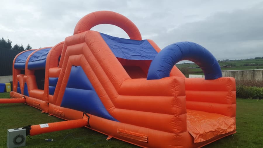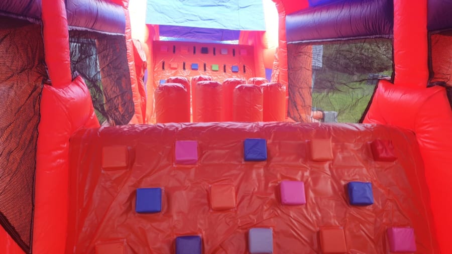 Check out our new 45 ft red and blue adrenaline booster obstacle course. Sure to be a big hit and suitable for both boys and girls. Loads of fun from when you enter obstacle course though entrance to series of bish and bash and pillars and over climbing wall and more tunnels and a high climbing wall and down the high slide. Has netting on both sides for easy supervision.