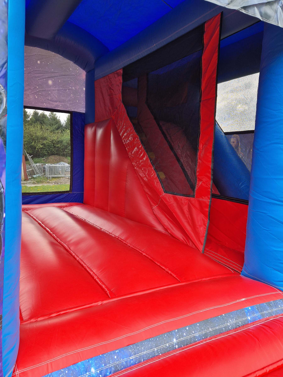 Our New MARVEL themed combi has been digitally printed to give it that wow factor. Has all your favourite marvel characters from HULK, CAPTION AMERICA, IRON MAN, and many more, Sure to be a big hit for marvel fans.. Has a large bouncy area with bish and bash and a slide inside the castle with a 3D sign on front of castle.