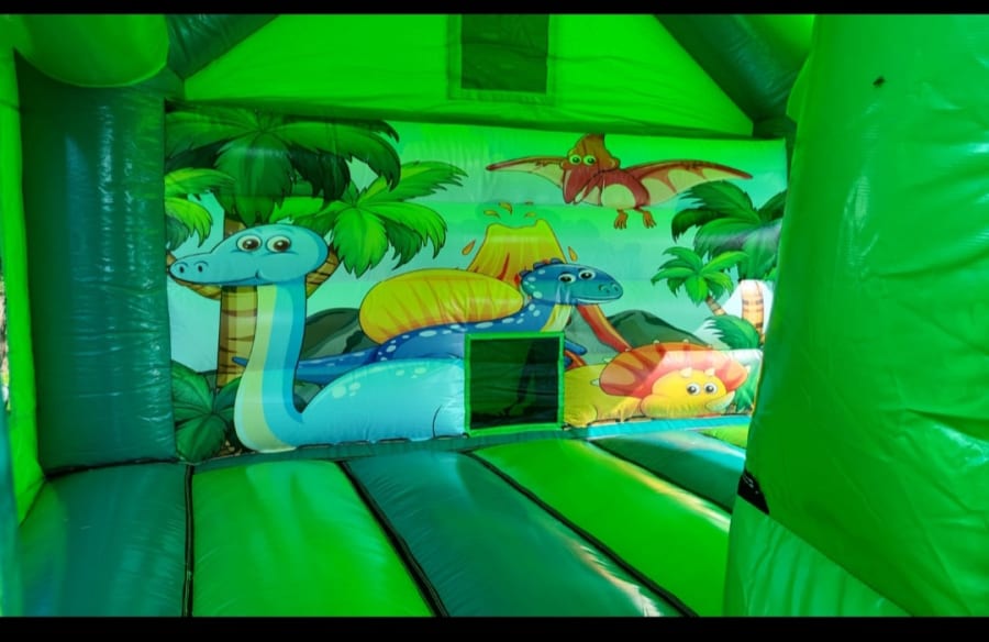 Our DINO 3D COMI CASTLE Dinosaur themed bouncy castle with slide on front of castle.. Large bounce area and up and over slide through its head if you dare. 3D HEAD for that WOW FACTOR with digital printing with all your favourite dinosaur s. fun for boys and girls and comes with a rain cover so rain s no problem..