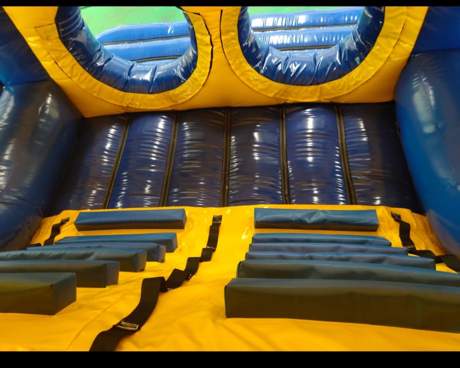 Check out our new 40 ft minnions obstacle course. Sure to be a big hit and suitable for both boys and girls. Loads of fun from when you enter obstacle course though entrance to series of bish and bash and pillars and over climbing wall and more tunnels and a high climbing wall and down the high slide. Has netting on both sides for easy supervision.