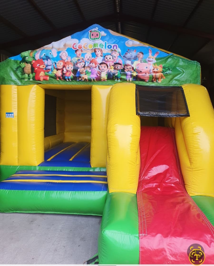 Our COCOMELON BANNER CASTLE is perfect for smaller kids and for smaller gardens. With a bouncy area and a slide at front of castle its sure to be lots of fun for all the COCOMELON FANS. Suitable for boys and girls and comes with a rain cover so no worries if it rains.