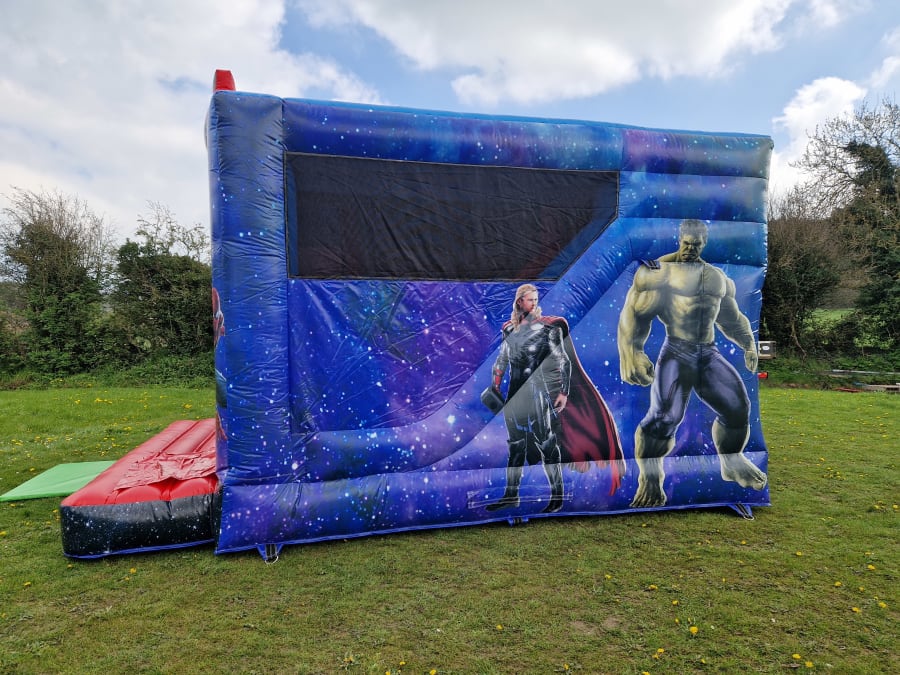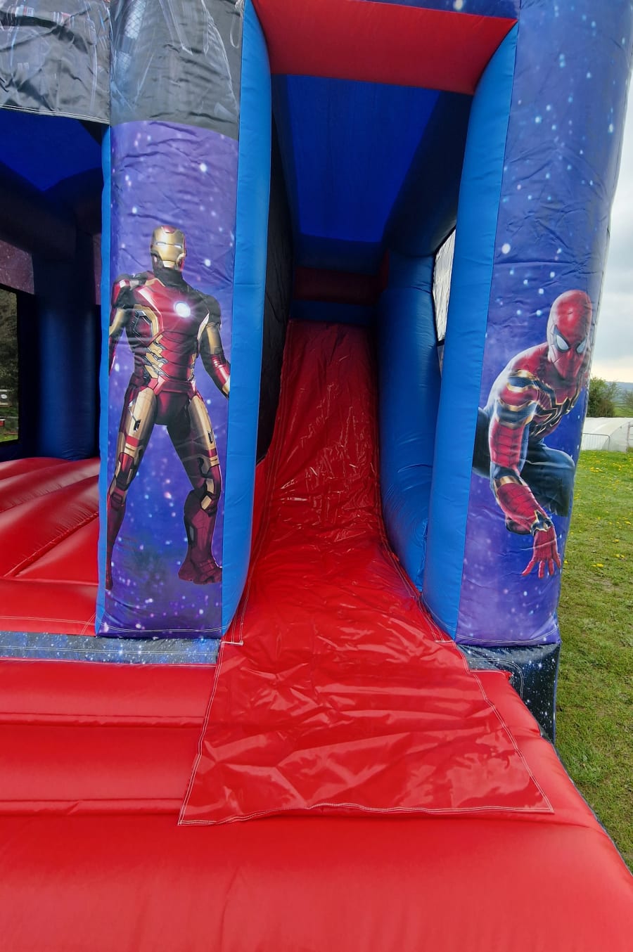 Our New MARVEL themed combi has been digitally printed to give it that wow factor. Has all your favourite marvel characters from HULK, CAPTION AMERICA, IRON MAN, and many more, Sure to be a big hit for marvel fans.. Has a large bouncy area with bish and bash and a slide inside the castle with a 3D sign on front of castle.