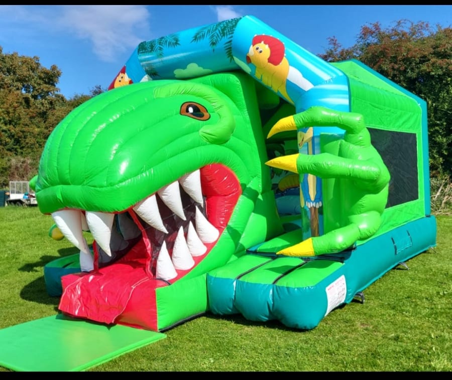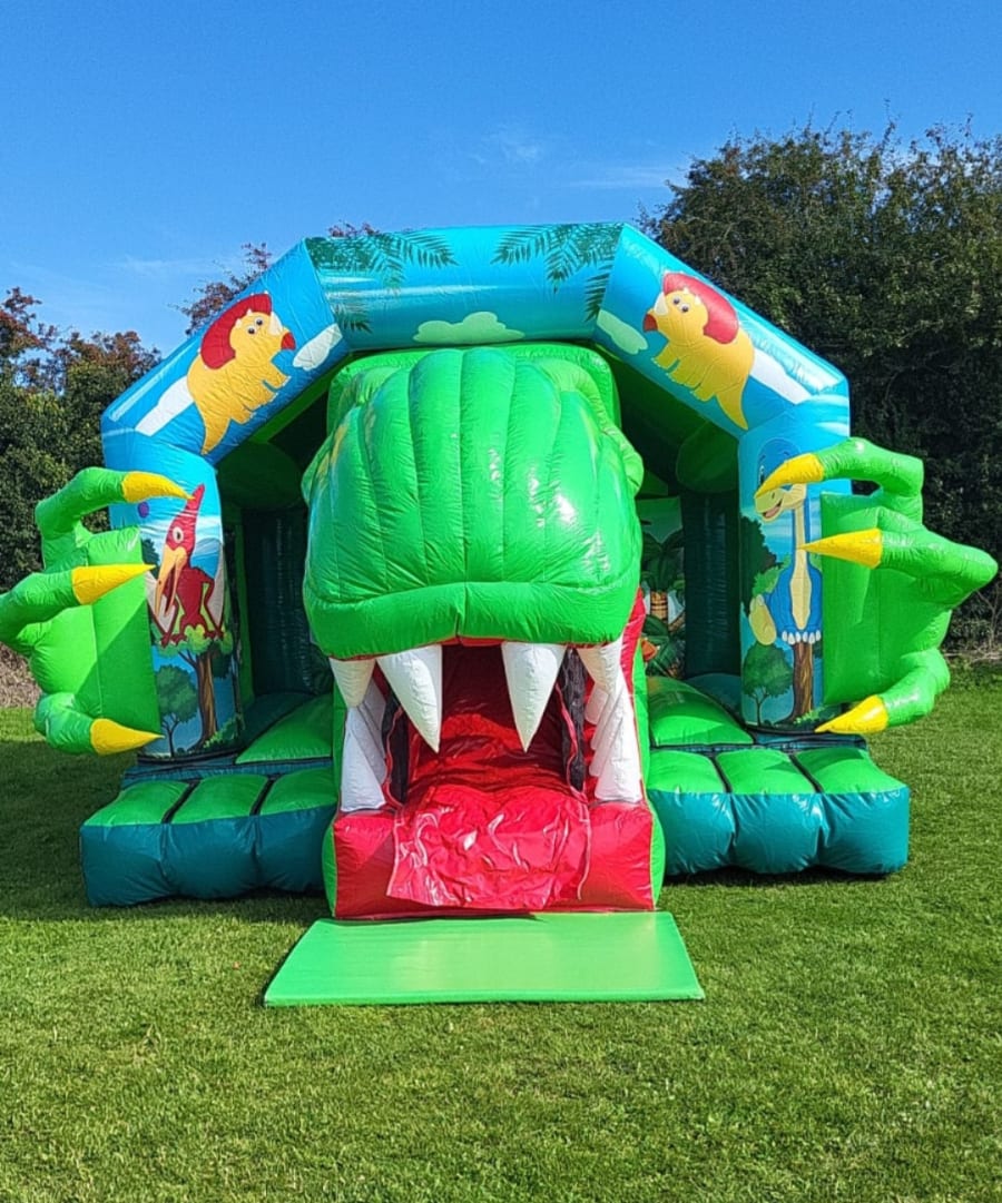Our DINO 3D COMI CASTLE Dinosaur themed bouncy castle with slide on front of castle.. Large bounce area and up and over slide through its head if you dare. 3D HEAD for that WOW FACTOR with digital printing with all your favourite dinosaur s. fun for boys and girls and comes with a rain cover so rain s no problem..