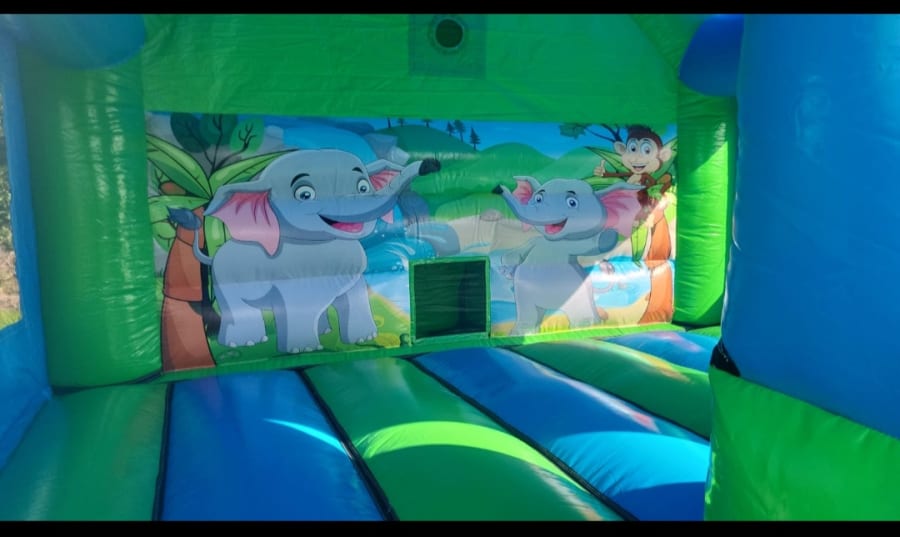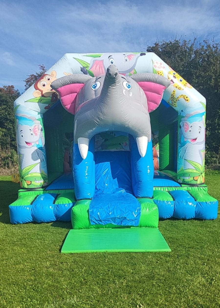 Our ELEPHANT 3D CASTLE with slide on front of castle under the ELEPHANTS HEAD has the WOW FACTOR for any party, All digitally printed and a elephants head in 3d above the slide is sure to make your party the best. Fun for both boys and girls and has a rain cover in case it rains..