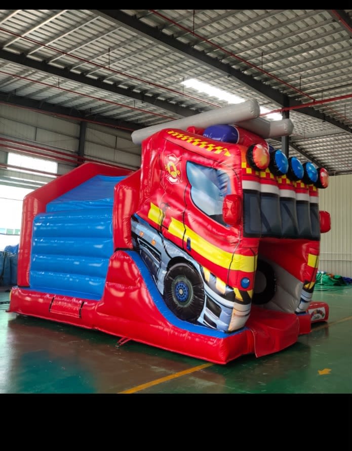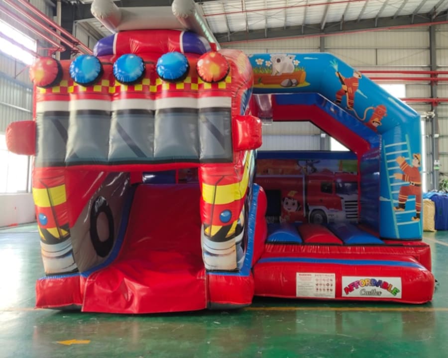 Our FIRETRUCK 3D CASTLE with slide on front of castle has the WOW FACTOR for any party .Designed by ourselves and digitally printed castle and SLIDE in 3d above the slide is sure to make your party the best. Fun for both boys and girls and has a rain cover in case it rains..
