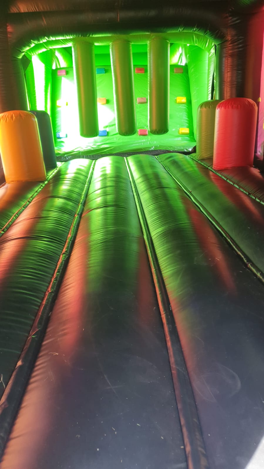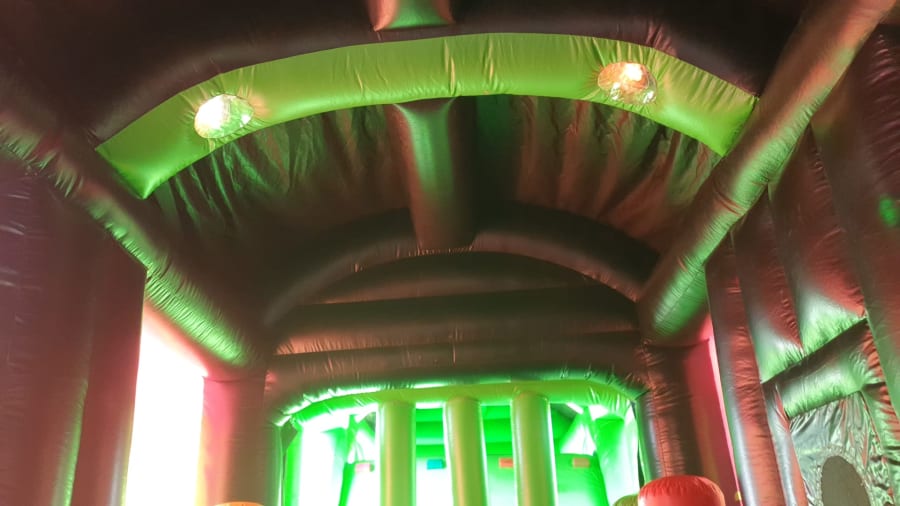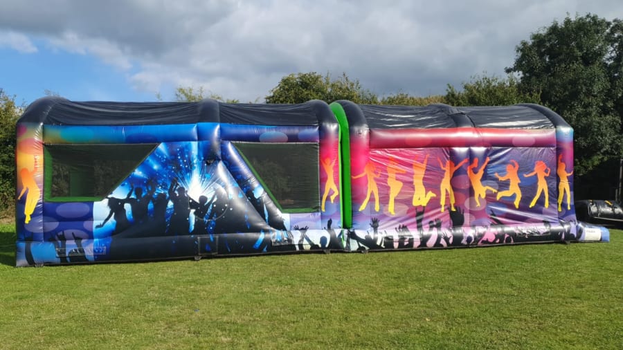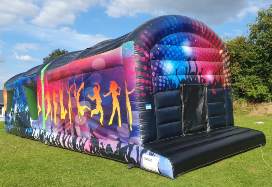 The large obstacle course has a large disco area with disco lights and sound system. Just BLUETOOTH your phone to the speaker and play any music on ur phone and bounce away on the large bouncy dancefloor. It also has a rock climbing wall and a slide for lots of fun. Suitable for boys and girls of all ages and will make any party one to remember/ CONTAINS STROBE LIGHTING.