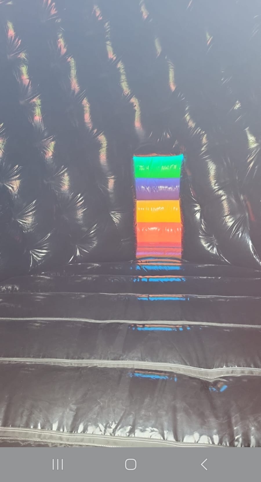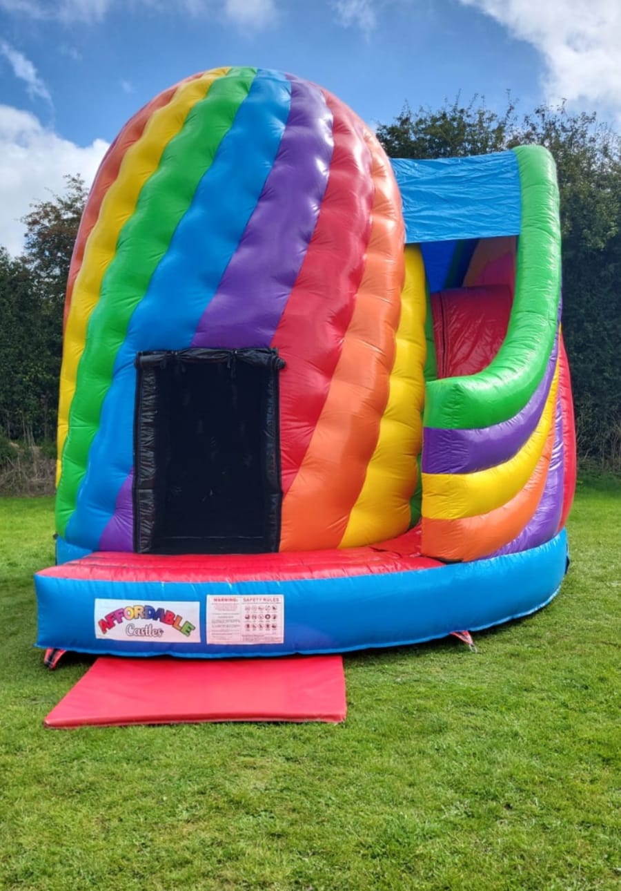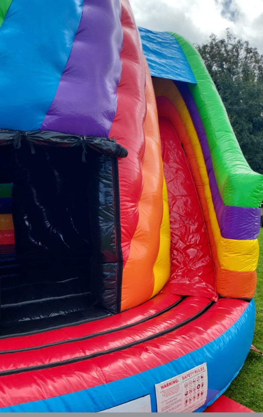 Our RAINBOW DISCO DOME COMBI comes with its own disco lights and speaker and you just blue tooth your phone to the speaker and play any music on your phone. Bouncy area and has a slide for that wow factor. Suitable for both boys and girls and no worries if it rains as has a raincover.