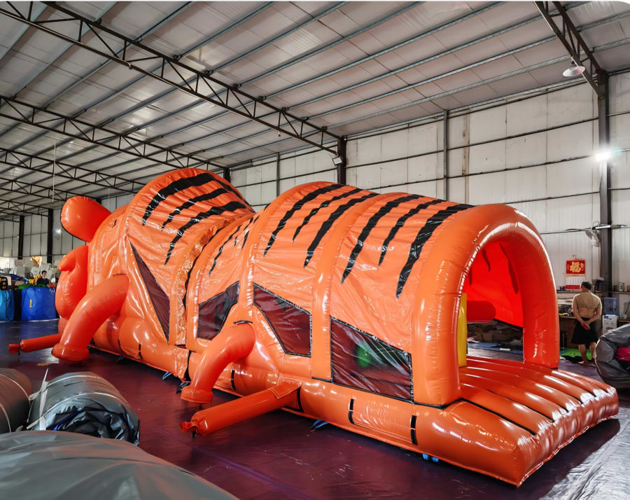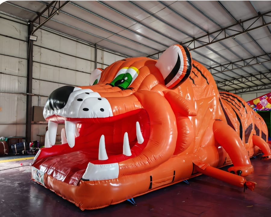 Our NEW 36 FT TIGER OB COURSE is perfect for those smaller gardens and is sure to be a big hit for both boys and girls. Its fully covered from the time u enter obstacle course till you come out its mouth... The fun starts as u enter from the back and go through all he obstacles from Bish bash bouncy area a rock climbing wall and a slide at end of obstacle course. Safety netting on both sides for ease of supervision and suitable for kids of all ages.