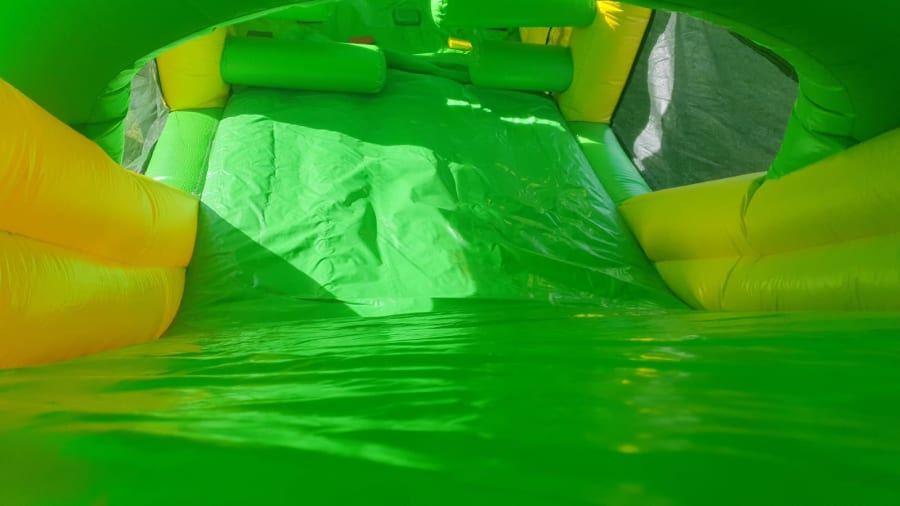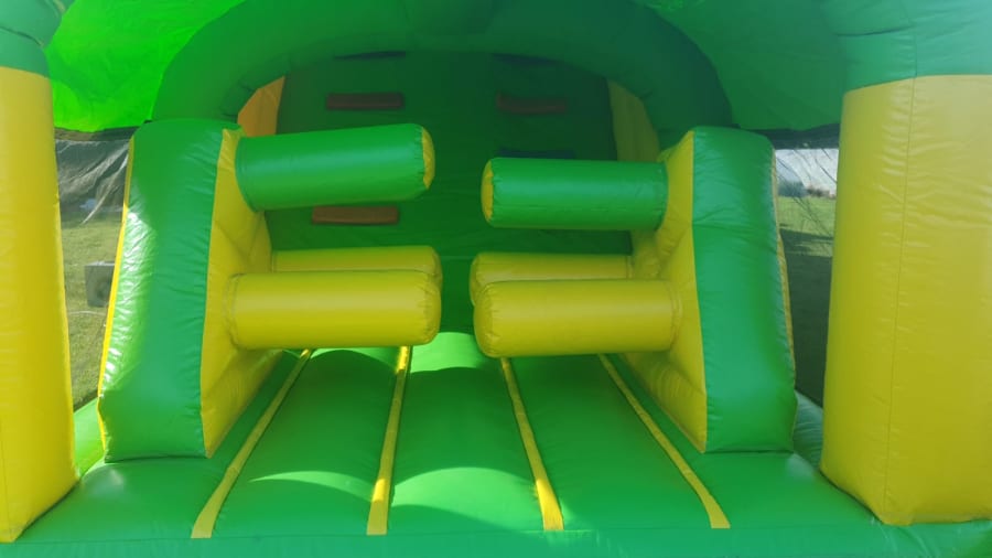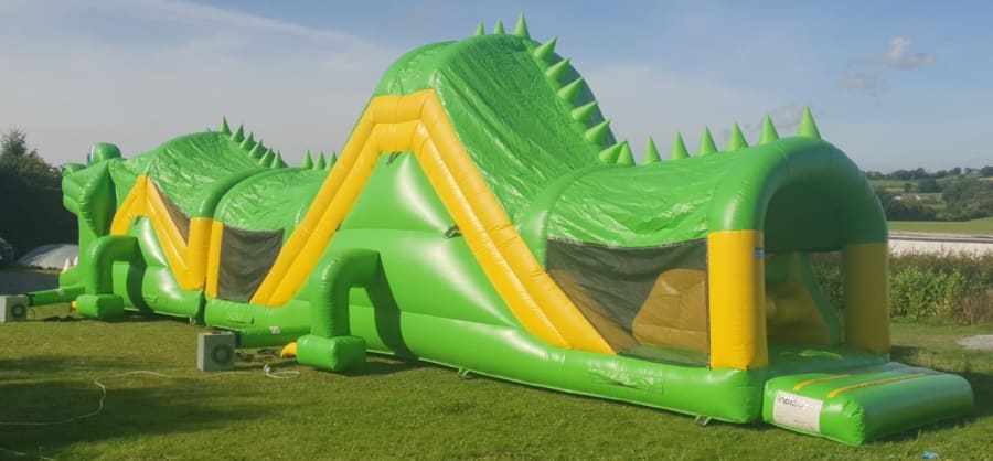 OUR 55 FT HIGH SLIDE OBSTACLE COURSE is one for those boys and girls that love a high slide and is suitable for both boys and girls. This would be one of our bigger obstacle courses and boasts at 55 ft long' You enter from the back with double sideways bish and bash and then to bouncy area before you have a large climbing wall and down the large slide into the body of this beast. Again your met with sideways bish and bash before you have another rock climbing wall and down another slide to come out the beast s mouth. Netting on sides for easy supervision and fully covered in case it rains.