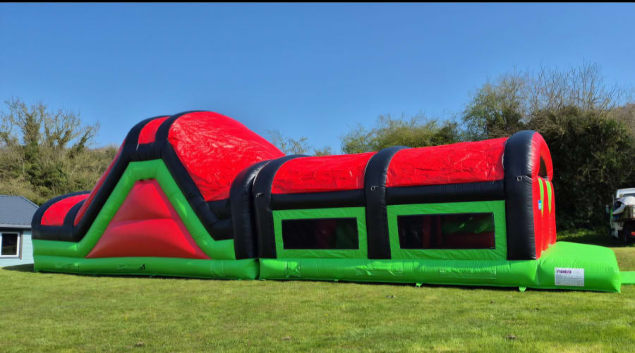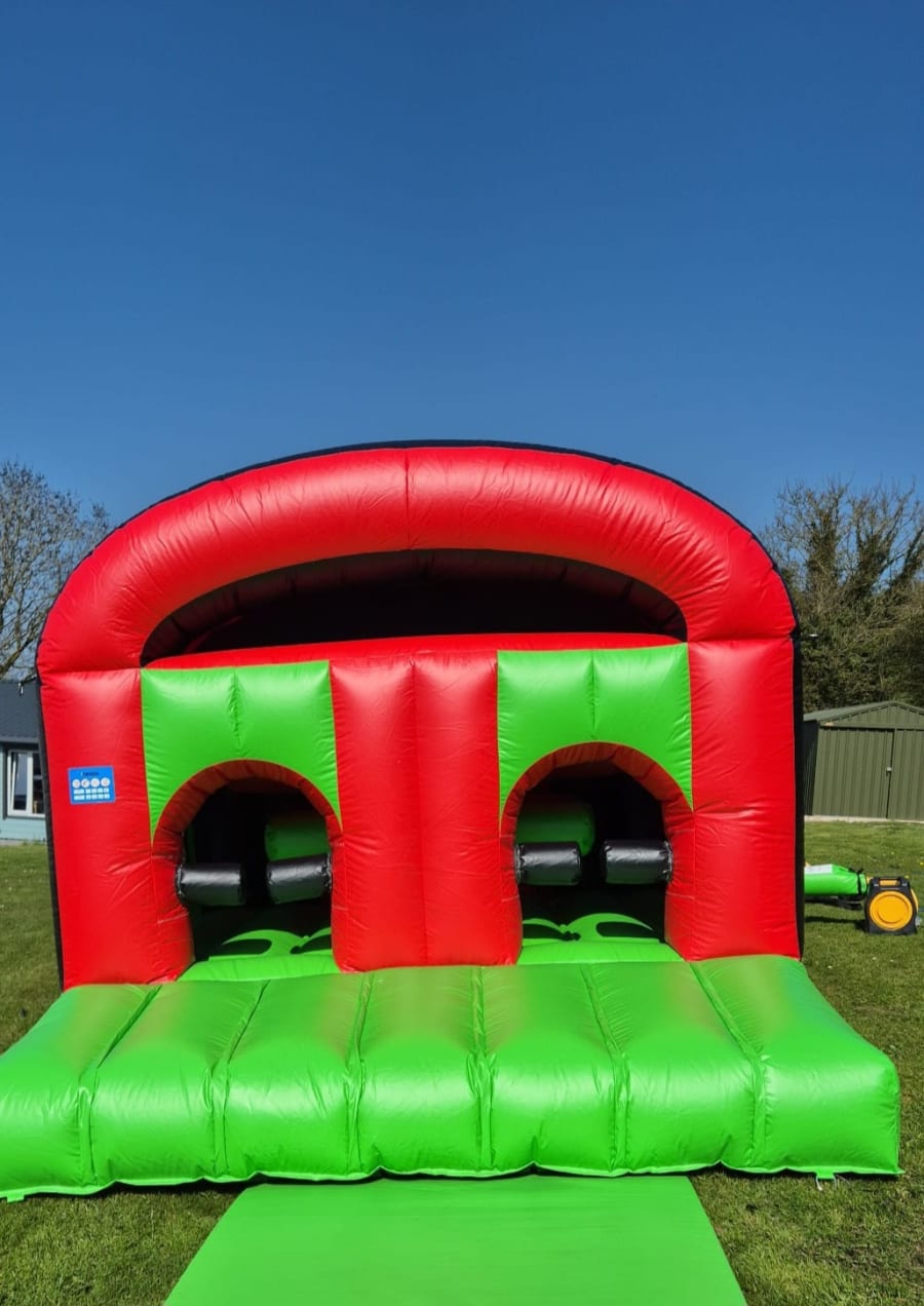 Check out our new adrenaline max obstacle course with a high slide. This is hugely popular with older kids and suitable for both boys and girls. Once you enter obstacle course you are faced with a series of bish and bash climbing wall, through tunnels and then up the 10 ft climbing wall to the top of the high slide and then slide. All fully covered so a bit of rain is no problem and has netting on sides for easy supervision.